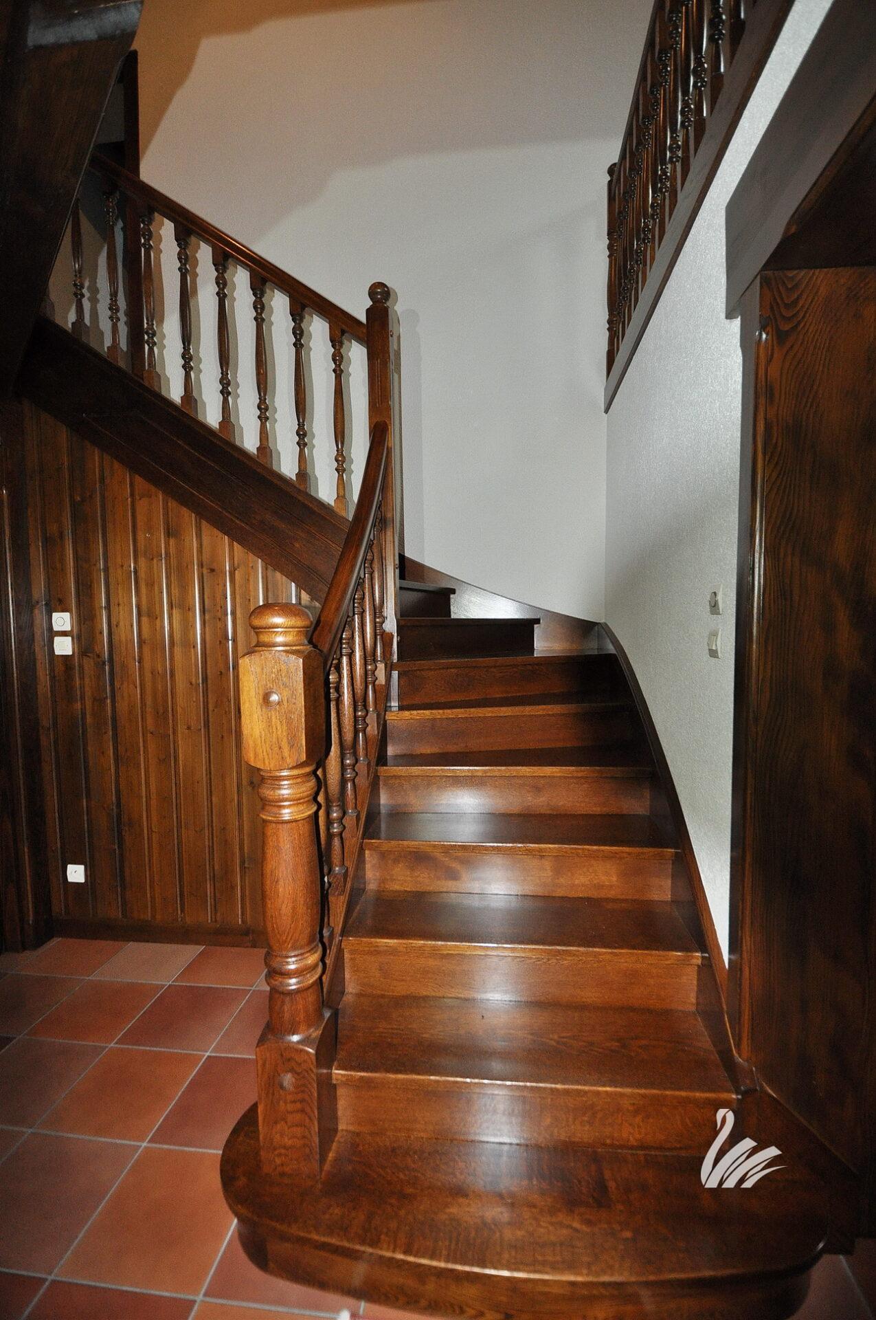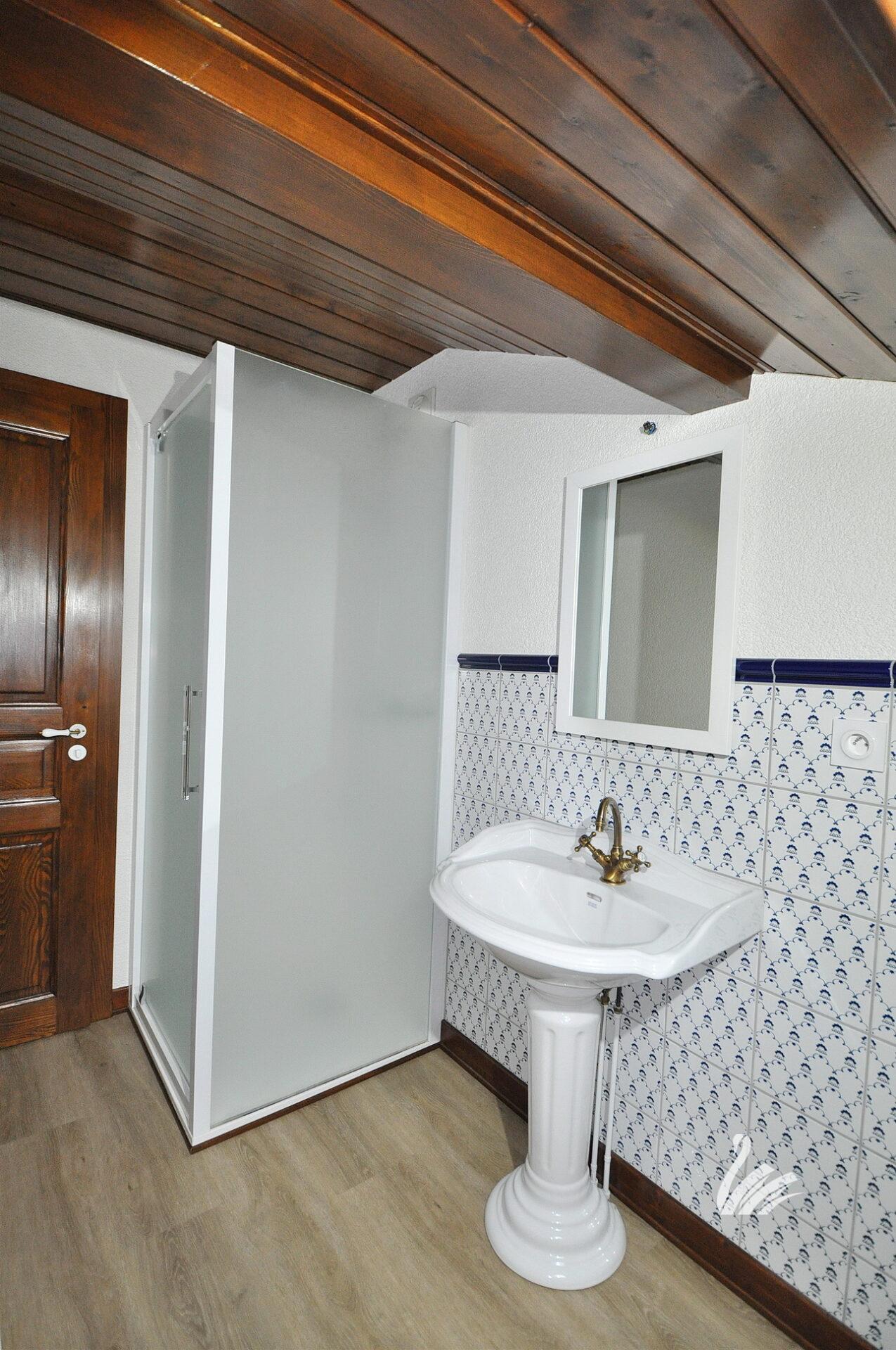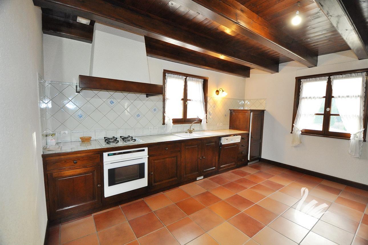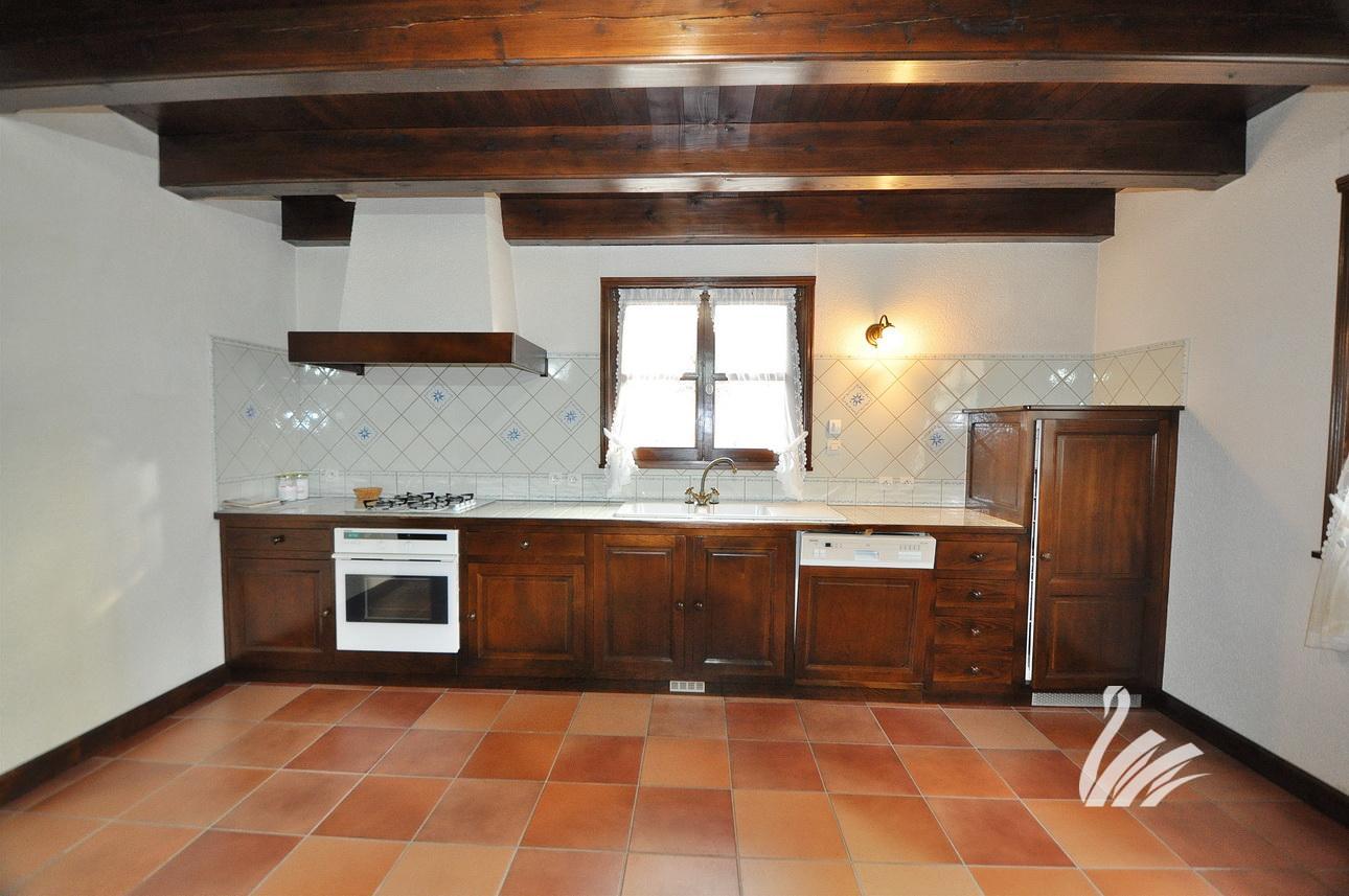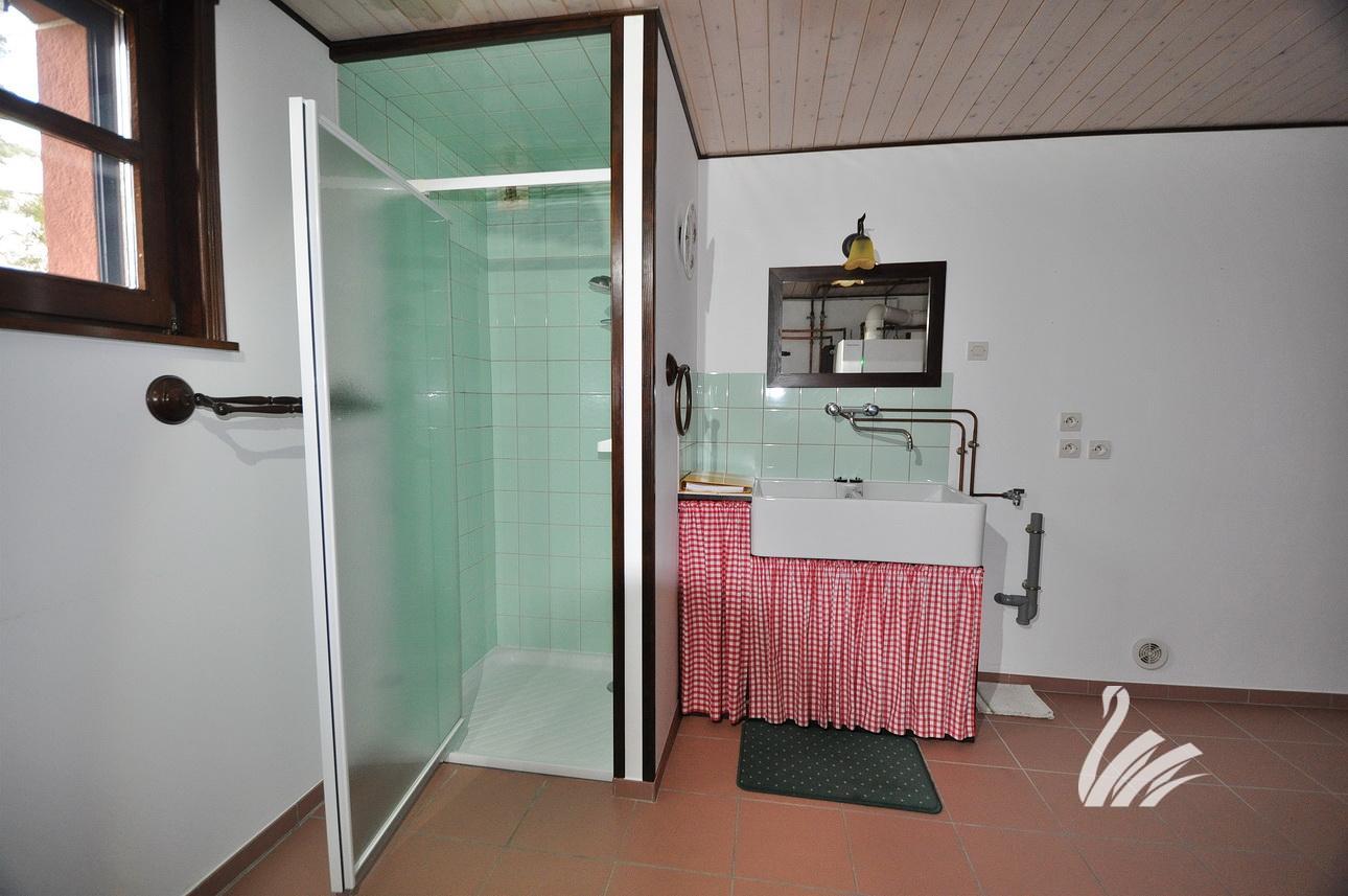 REZ-DE-CHAUSSÉE : 1 hall d’entrée + placards, dégagement, 1 WC + lave-mains, 1 grand salon séjour avec cheminée à l’âtre + poêle faïence, 1 cuisine intégralement équipée avec coin repas, 1 chaufferie / buanderie avec douche.