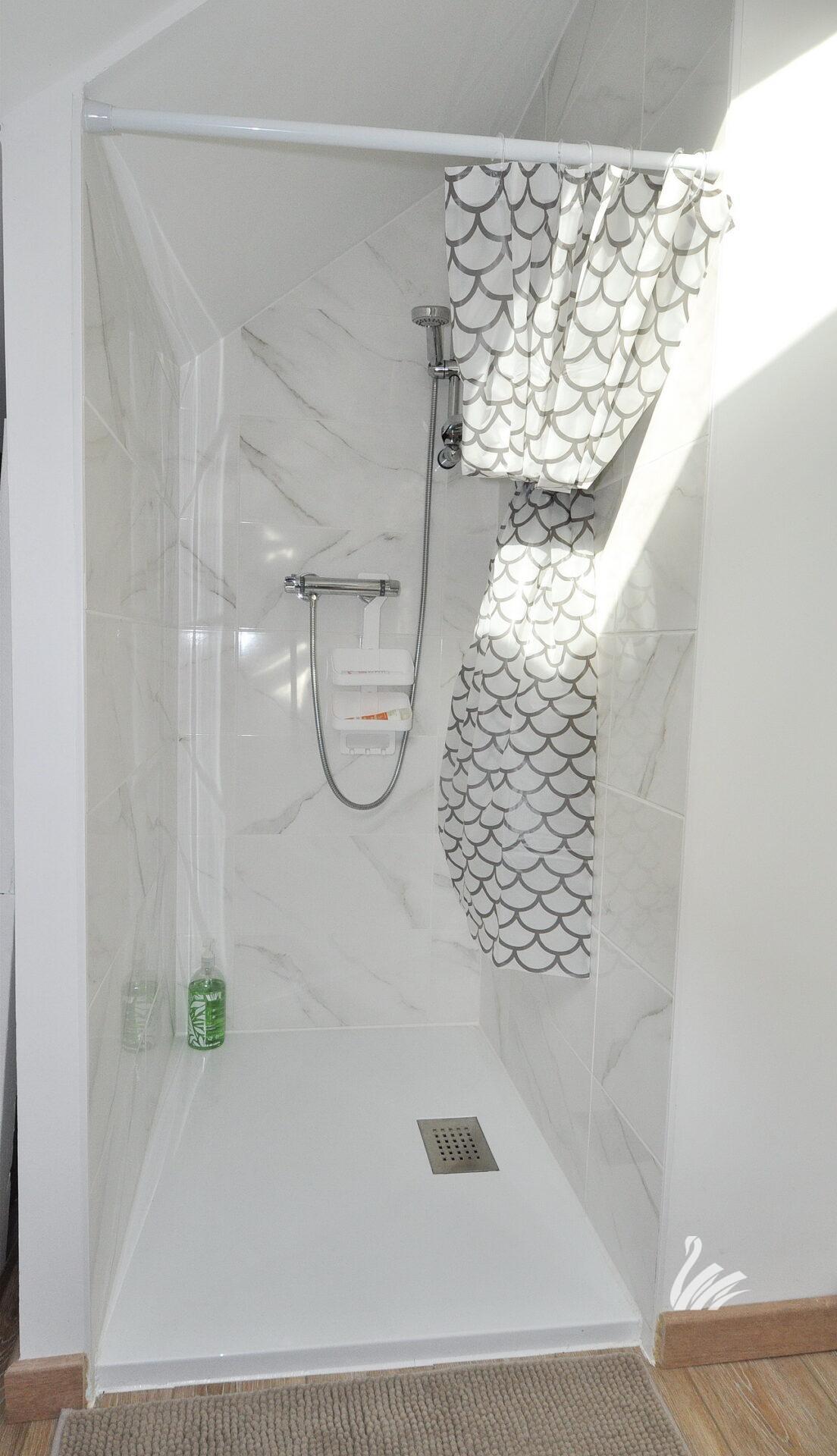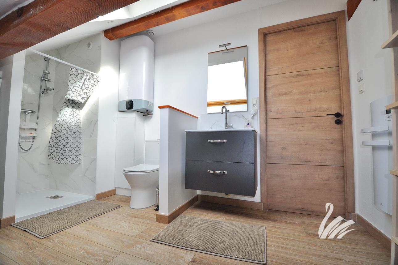 1 palier, 1 hall d’entrée + placards, dégagement, 1 cuisine intégralement équipée sur salon séjour, 1 chambre, 1 salle de douche + meuble + WC + espace buanderie.