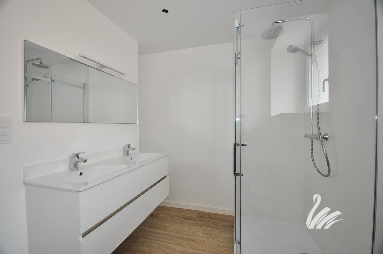 1 hall d’entrée, dégagement, 1 cuisine intégralement équipée avec coin repas sur grand salon séjour avec accès terrasse & jardin privatif de 93 M², 2 chambres, 1 salle de douches à l’italienne + meuble + WC.