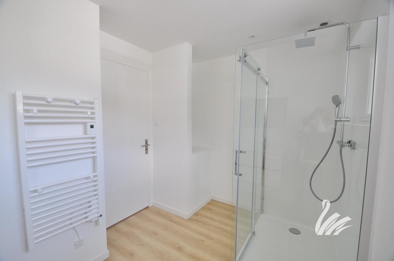 1 hall d’entrée, dégagement / placards, 1 cuisine intégralement équipée avec coin repas sur grand salon séjour avec accès balcon périphérique de 16 M², 1 chambre, 1 salle de douches à l’italienne + meuble, 1 WC.