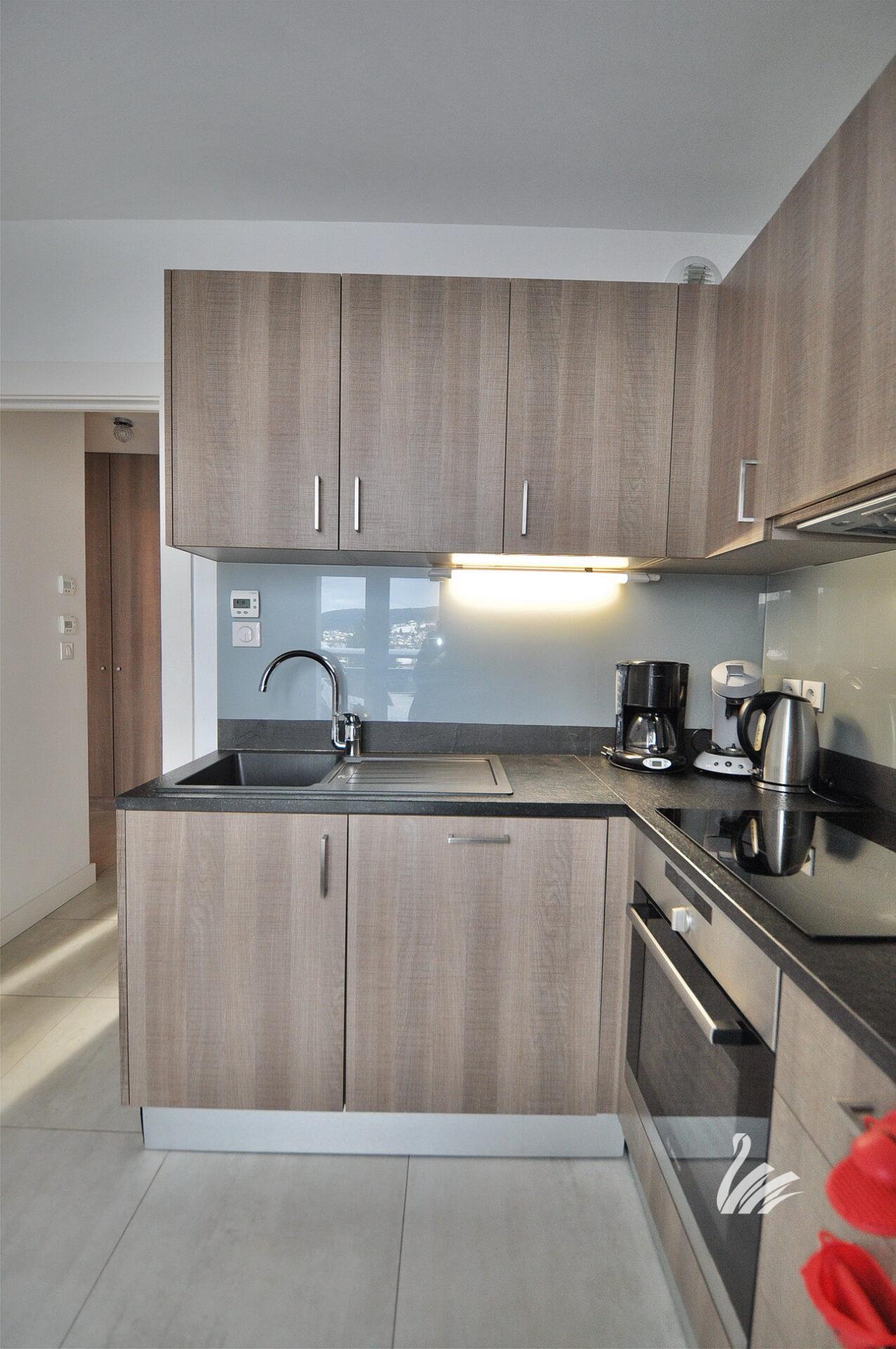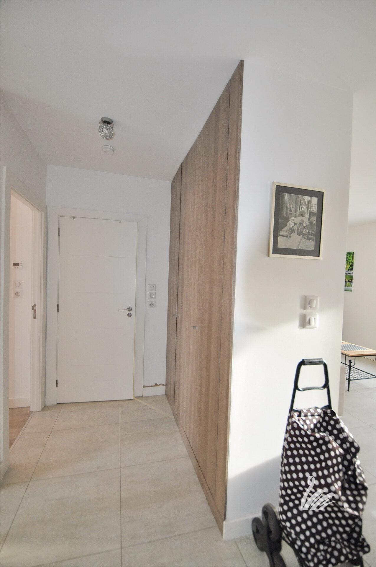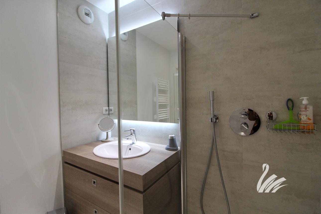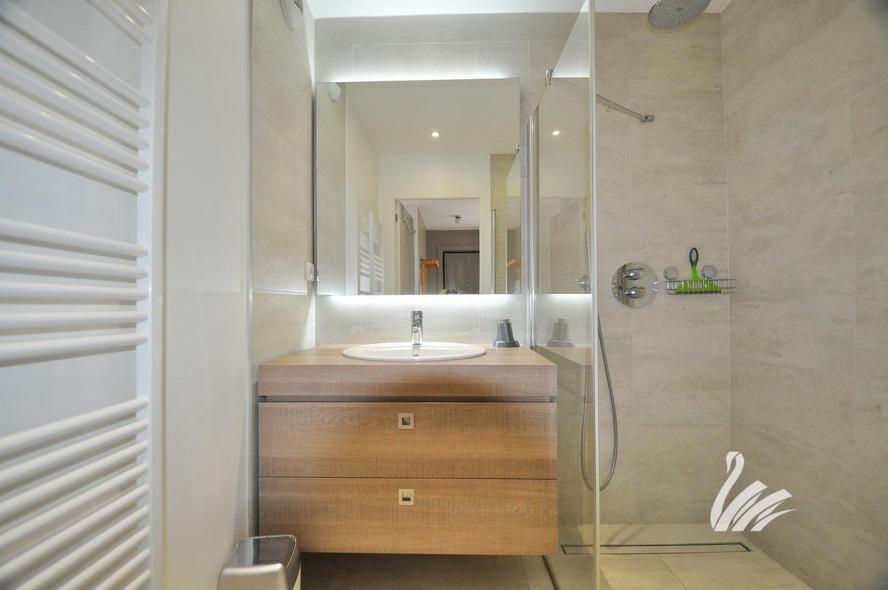1 hall d’entrée, dégagement / placards, 1 cuisine intégralement équipée avec accès terrasse de 15.80 M², 1 salon séjour, 1 chambre + placards avec accès terrasse de 15.80 M², 1 WC + lave-mains, 1 salle de douches à l’italienne + meuble.