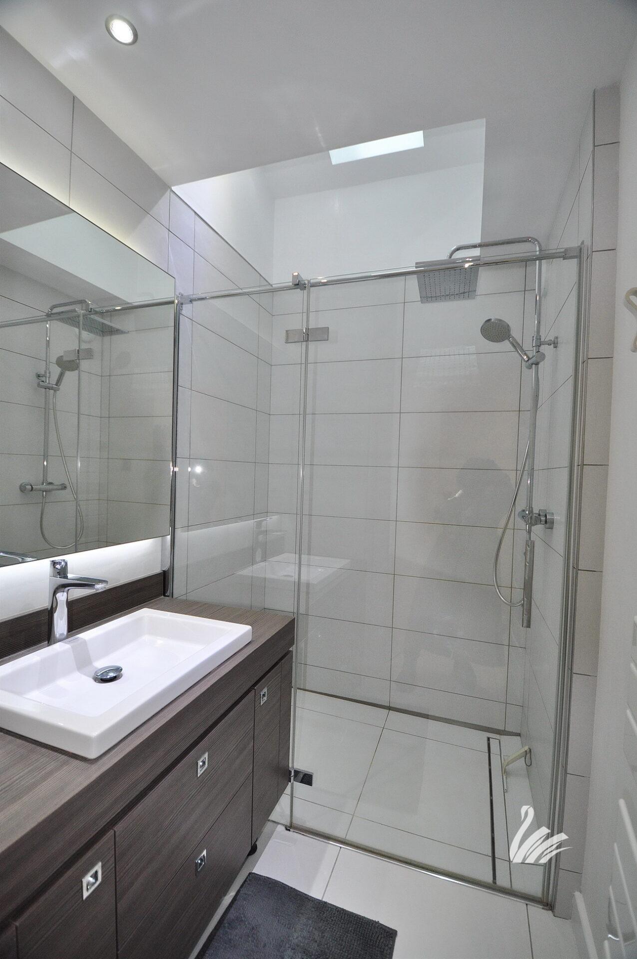 1 hall d’entrée + placards, dégagement, 1 cuisine intégralement équipée sur salon séjour avec accès terrasse de 18.70 M², 2 chambres avec placards / dressing, 1 WC + lave-mains, 1 salle de douches à l’italienne + meuble, 1 cellier / rangements / buanderie.