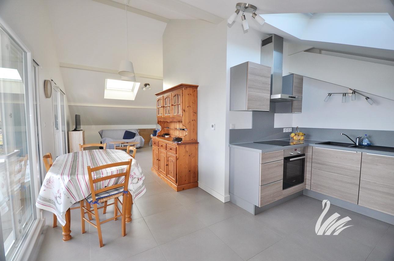 1 hall d’entrée + placards, dégagement, 1 cuisine intégralement équipée sur salon séjour avec accès terrasse de 17.80 M², 2 chambres avec placards / dressing, 1 WC + lave-mains, 1 salle de douches à l’italienne + meuble, 1 cellier / rangements / buanderie.