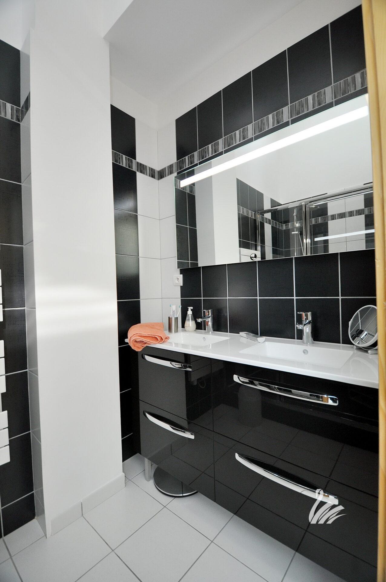 1 hall d’entrée / dégagement, 1 WC, 1 cuisine intégralement équipée avec coin repas sur grand salon séjour avec verrière, 1 grand cellier / buanderie / chaufferie, 1 salle de douche à l’italienne + meuble, 1 chambre, 1 chambre / salon + placards avec espace couchage en mezzanine.