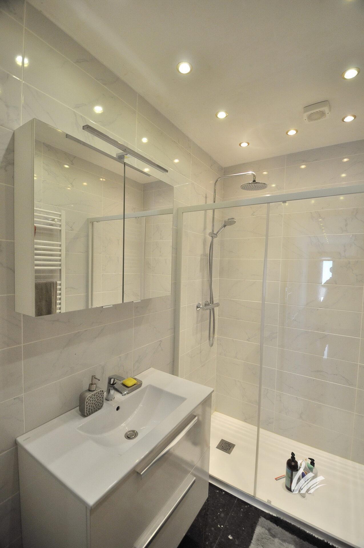 1er ÉTAGE : Grand dégagement, 1 grande salle de bains + douche + meuble, 1 très grande chambre dortoir, 1 WC + lave-mains, 2 grandes chambres + placards.