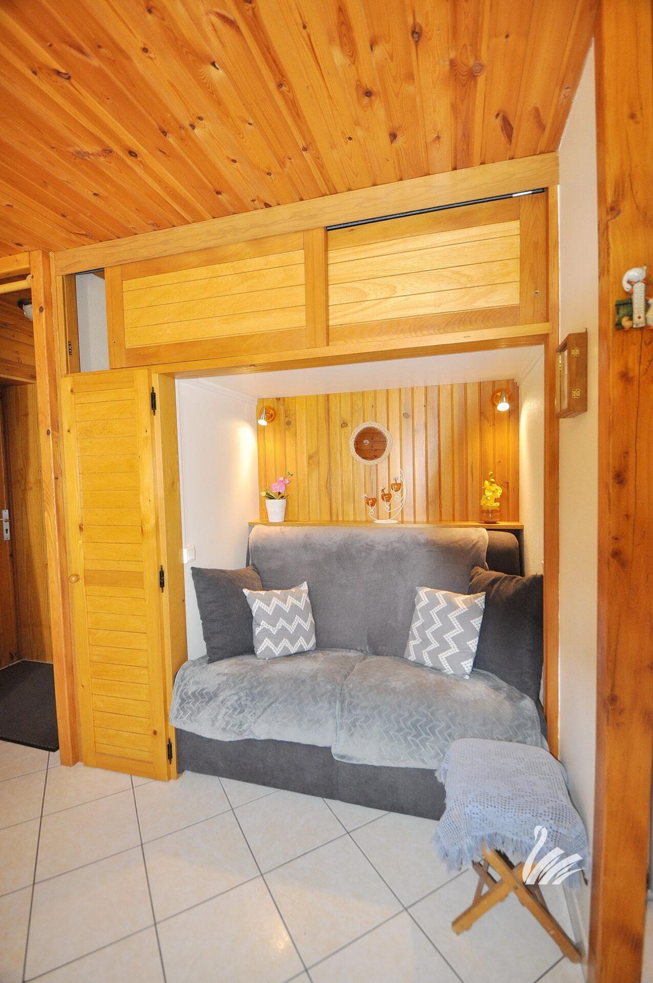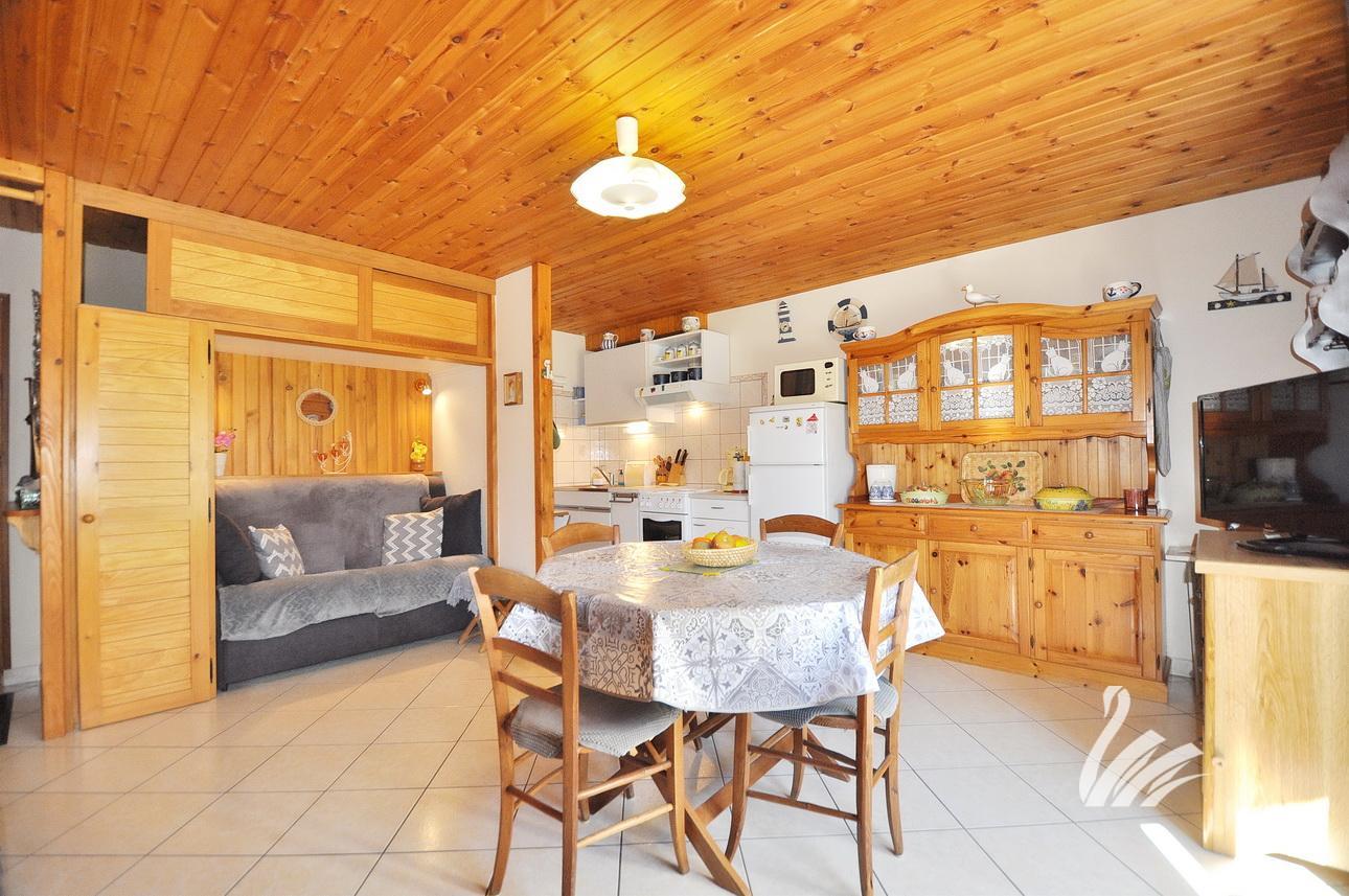1 hall d’entrée / dégagement, 1 cuisine en partie équipée sur salon séjour avec accès terrasse & jardin privatif, 1 espace « coin montagne », 1 chambre + rangements, 1 salle de douches + meuble + WC.
